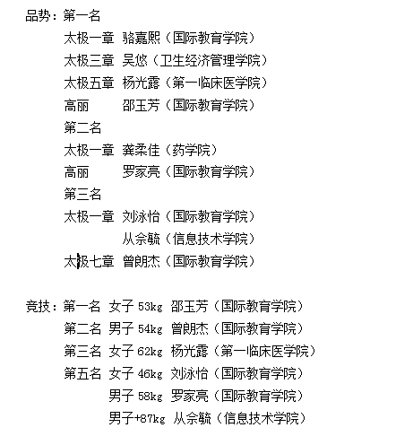 我校跆拳道校队在姚焱兵和蒋向华二位老师的带领下,经过激烈的角逐,取得品势太极一章、太极三章、太极五章、高丽项目4个项目第一名的好成绩,在其他项目比赛中也取得了良好名次。队员们用奋力拼搏的精神面貌和优异的比赛成绩,展现了我校体育教育教学工作的专业水平和实力,为学校赢得了声誉。