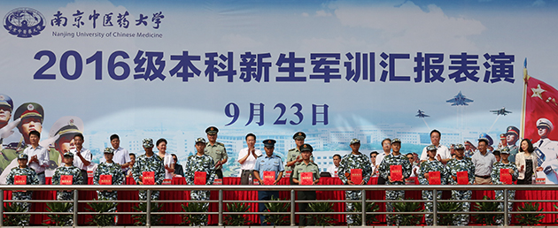 军训汇报表演结束后,主席台领导向获奖人员颁发了证书。军训先进个人获得者、护理学院朱光宇同学代表全体新生发言,他表示:军训给同学们带来了的宝贵财富,要把军训的收获化为前行的动力,不断挑战自我、超越自我,为圆满完成大学生活、振兴中医药事业而努力。南京中医药大学党委书记陈涤平教授代表学校向解放军理工大学国防工程学院赠送锦旗。