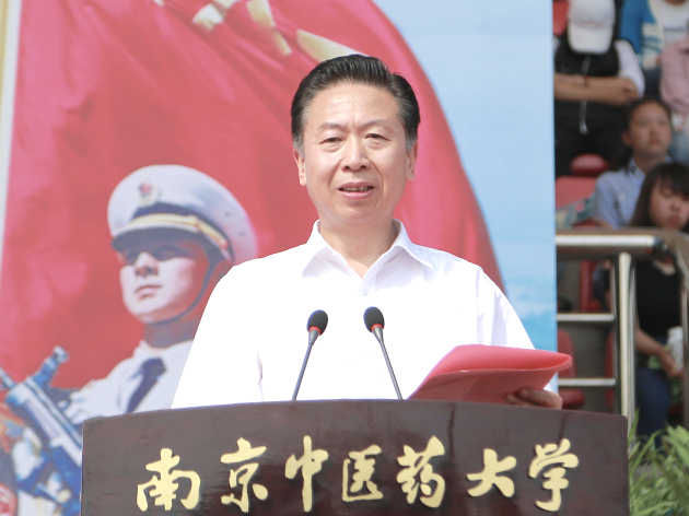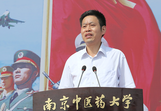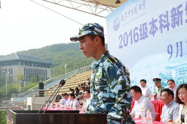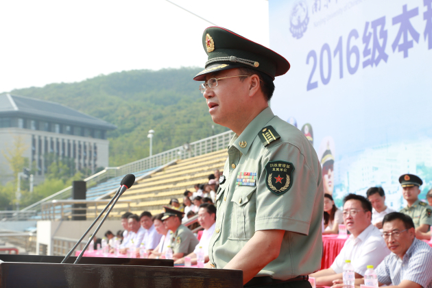 解放军理工大学国防工程学院副院长徐军大校代表承训单位致辞,他对同学们的军训成果表示肯定,向同学们阐述了军训的重要意义,祝福同学们在未来的学习和生活中取得更大的成绩,并祝南京中医药大学越办越好。