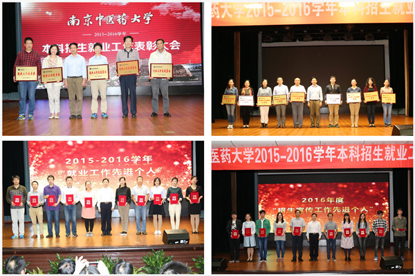 黄桂成副校长宣读《关于表彰南京中医药大学2016年度招生宣传工作先进集体与先进个人的决定》《关于表彰南京中医药大学2015-2016学年就业工作先进集体和先进个人的决定》。胡刚校长、张策华副书记分别为获得表彰的先进集体和个人代表颁发了荣誉证书。招生优秀宣讲专家、基础医学院王明强教授,招生宣传工作先进个人、第一临床医学院朱玉婕同学,就业工作先进个人、信息技术学院沈静老师分别作为获奖代表发言。