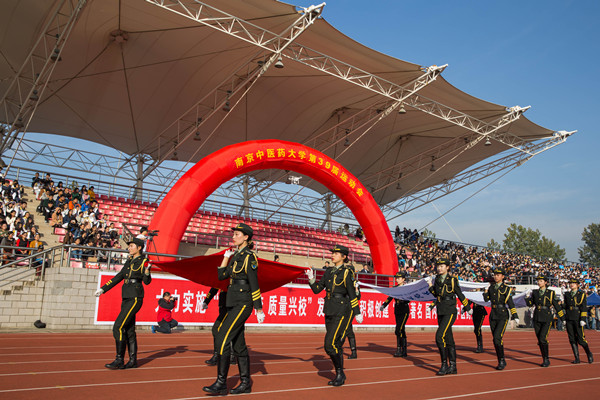 11月4日,连续阴雨始放晴的天空把南京中医药大学西操场装扮清新明媚,伴着初升的艳阳,我校第39届校运会隆重召开。开幕式由校党委副书记王长青同志主持,校党委副书记、纪委书记张策华同志致开幕词。在国旗班方阵、校旗班方阵和仪仗队的带领下,来自各院系和单位的教工和学生方阵依次进场,整齐的步伐和独具创意的队形变化展示了我校师生锐意进取、开拓创新的精神面貌。