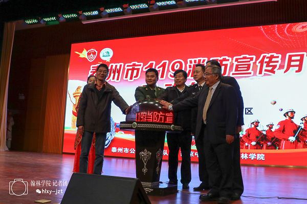 11月9日翰林学院与泰州市公安消防支队在学院小剧场以“消除火灾隐患 共建平安社(校)区”为主题联合举办“泰州市119消防安全宣传月启动仪式”“平安翰林”系列活动。市人大常委会副主任戴胜利、市公安局副局长张卫东、泰州消防支队支队长花冰、医药高新区人大常委会主任、政法委书记任志强、翰林学院党委书记唐传俭、院长沈大庆等领导出席,消防支队的部分消防官兵和学院的千余名师生参加了活动。