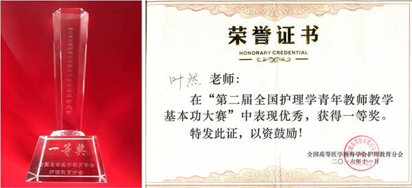 11月12日-13日,第二届全国护理学青年教师教学基本功大赛在南京隆重举行,来自全国78所医学院校的教师代表参加了本次大赛。经过大赛专家组对78名选手提交的授课视频初审,最终遴选出32位教师入围决赛。我校参赛选手护理学院叶然老师在大赛中,表现优秀荣获一等奖。