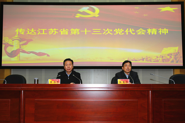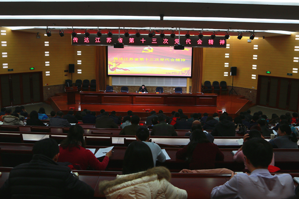 11月23日下午,我校在丰盛楼学术报告厅召开会议,校党委陈涤平书记传达了江苏省第十三次党代会精神,并就学习贯彻党的十八届六中全会精神为党员干部上专题党课。校领导、全体中层干部、辅导员、思政课教师、党支部书记参加了会议,会议由校党委副书记、纪委书记张策华主持。