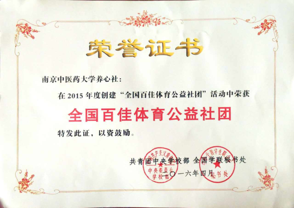 我校"养心社"学生社团荣获“全国百佳体育公益社团”荣誉称号