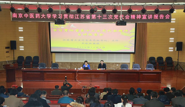 12月7日下午,省第十三次党代会精神宣讲报告会在我校仙林校区丰盛楼学术报告厅举行。全体在校校领导,中层干部,正科党员干部,党支部书记,全体思政课教师,附院党员干部代表,学生党员代表,各民主党派负责人共400余人出席了报告会。省委宣讲团成员、省卫计委党组书记、主任王咏红作了题为《打造健康江苏,助推全面小康》的学习贯彻省第十三次党代会精神宣讲报告,报告会由我校党委陈涤平书记主持。