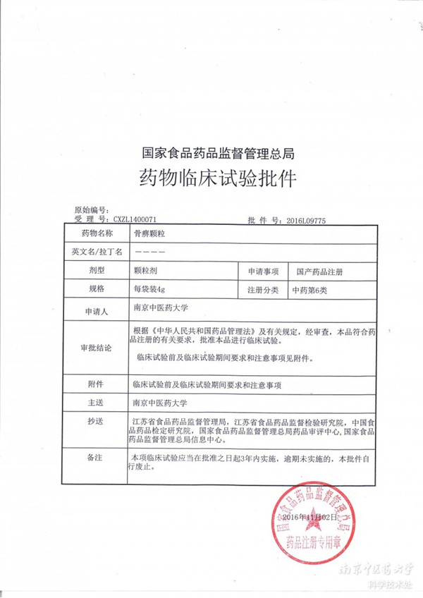 “骨痹颗粒”是南京中医药大学自主申报的中药新药,依托于江苏省中药资源产业化过程协同创新中心完成,是中医药传承创新、医药协同取得的研究成果。项目负责人为周学平教授,药学研究、药理毒理研究工作分别由朱华旭教授、周玲玲副教授牵头完成,在研究期间获得发明专利1项、申报发明专利1项。2016年11月,获得药物临床试验批件(中药第六类)。