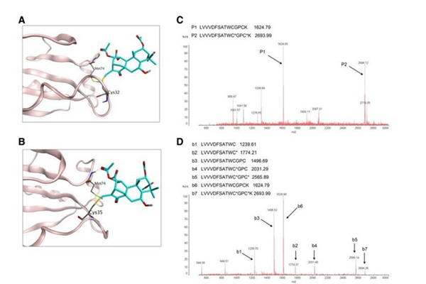 分子对接预测和质谱鉴定Isoforretin A与Trx1蛋白的Cys32和Cys35位点直接结合