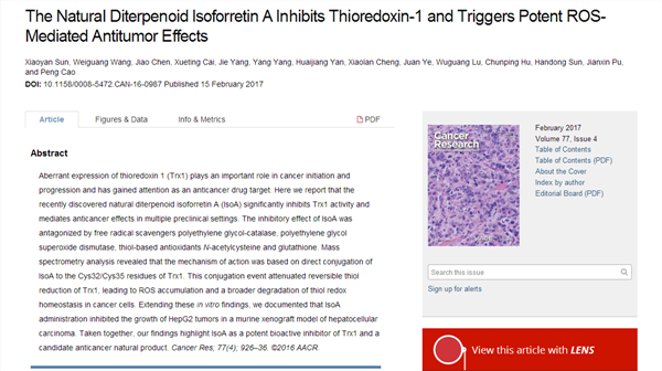 近日,我校第三临床医学院、附属省中西医结合医院曹鹏课题组发现了靶向硫氧还蛋白系统的抗肿瘤天然产物Isoforrestin A,并揭示了Isoforrestin A的作用机制和作用靶点,该研究成果于2017年2月15日正式发表于美国癌症研究协会(AACR)出版的国际知名期刊 《Cancer Research》(肿瘤学1区期刊,IF:8.556)。