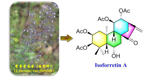 曹鹏研究团队与中国科学院昆明植物研究所孙汉董院士课题组合作开展了深入的学科交叉研究,从紫萼香茶菜(原变种)(Isodon forrestii var. forrestii)中发现了一个新的、多乙酰基氧化的对映-贝壳杉烷型二萜Isoforretin A。