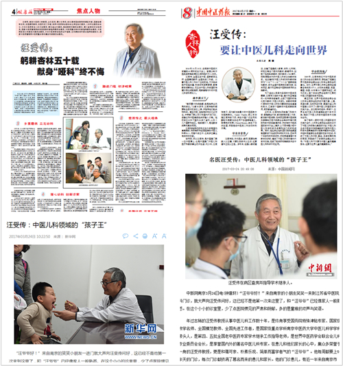 国家卫计委主管的国家级媒体《健康报》以《躬耕杏林五十载 ,献身“哑科”终不悔》为题刊发整版报道,回顾了中医儿科学学科带头人汪受传教授从“踏进门槛初涉岐黄”到“乡里磨练立志幼科”的早年经历,并通过“受而传之薪火相承”,“潜心幼科创新求索”及“老骥伏枥衣宽不悔”等篇章鲜活再现了汪受传教授五十年潜心于中医儿科,带领团队所取得的一系列突出成就。国家中医药管理局主管的行业权威媒体《中国中医药报》以《让中医儿科走向世界》为题,重点报道了我校中医儿科学学科建设方面取得的累累硕果,中医儿科学学科在汪受传教授的带领下,拥有三个全国“唯一”,可以说是“桃李遍天下,学术传五洲,学会连四海”,在海内外拥有广泛声誉。