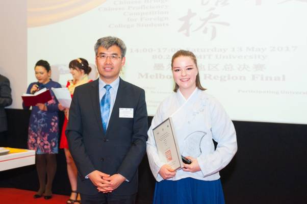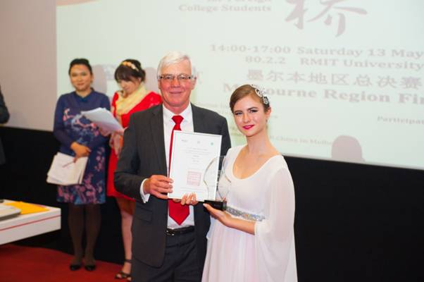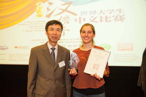 来自墨尔本大学的Bridie Allen(中文名宋玉滢)用地道、流利的汉语讲述了自己学习芭蕾舞的经历,并表达了毕业后去中国当舞蹈老师的梦想,在才艺表演环节又凭借优美的中国民族舞蹈《万花谷》征服了在场的评委和观众,夺得冠军。同样来自墨尔本大学的Anne-Aelis Perfrement(中文名刘思远)以舞剧《孔子》中的一段《熏香》获得亚军。皇家墨尔本理工大学选送的Ciara Gardiner(中文名葛海黎)在演讲中表示自己要成为中国的徐霞客,并用大提琴演奏中国传统歌曲《茉莉花》,最终获得季军。