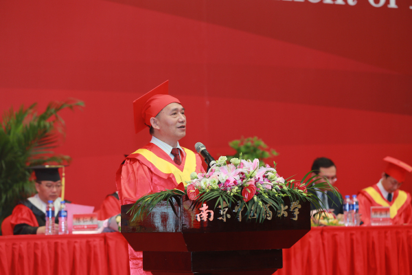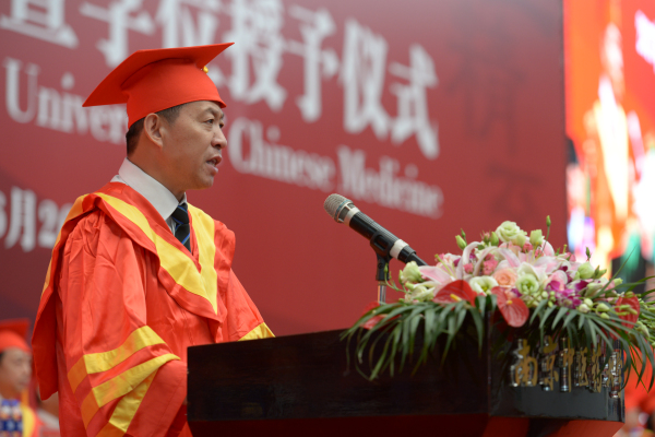 伴随庄严雄壮的国歌声,2017年毕业典礼暨学位授予仪式正式开始。典礼由校党委副书记、副校长、校学位委员会副主席王长青教授主持。胡刚校长代表学校向圆满完成学业的全体2017届毕业生表示热烈的祝贺和良好的祝愿。胡校长强调,在中医药和中华文明发展的长途中,我们最不可或缺的是一种向上的力量。入校初,南中医会让同学们进入一条科学规划、立德树人的向上的轨道。在校时,会致力培养同学们辨证论治、批判创新的思维方式,提升同学们自我反省、治病救人的能力。离校后,南中医将与同学们一路同行,南中医人永远是相亲相爱的一家人。同学们始终与母校相伴而行,校园的每一寸土地上都激荡回旋着南中医向上的力量,在建设一流中医药大学的进程中,全校师生上下一心,追求卓越,在综合实力、学科建设、科学研究、人才培养、社会服务、文化传承等方面都节节攀升。未来,学校将进一步深化结构性改革,构建传统中医药与现代医学深度融合的中国医学体系。胡校长殷切希望生逢盛世的毕业生在未来征途中,始终用心底不灭的理想之火去抵御岁月的雨雪风霜。