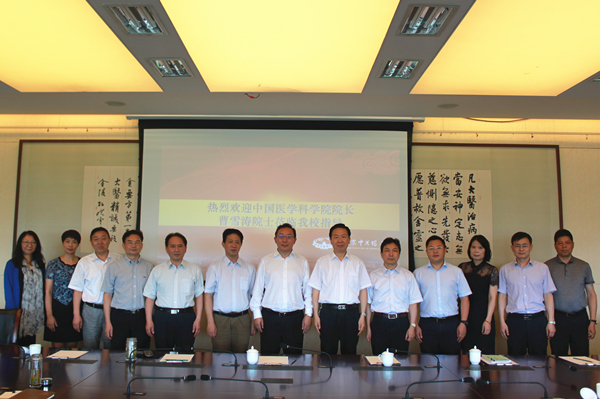 9月3日上午,中国工程院院士、中国医学科学院院长、北京协和医学院校长曹雪涛教授访问我校,就中国医学科学院与南京中医药大学如何深化合作、推进中国医学教育与科技创新,与学校领导班子进行会谈。校领导陈涤平、胡刚、张策华、黄桂成、程海波、谭仁详参加了会谈。