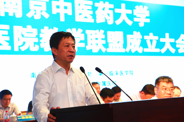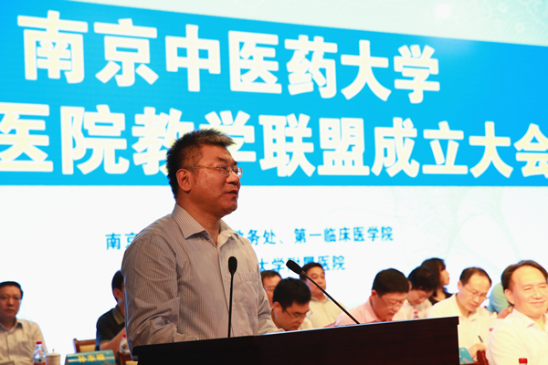 南京中医药大学党委陈涤平书记宣读《关于成立南京中医药大学附属医院教学联盟的决定》和南京中医药大学附属医院教学联盟首批20家医院成员名单。
