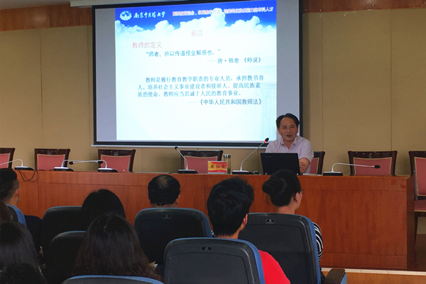 黄桂成副校长做了“更新教育观念,改革教学方法,培养岗位胜任能力的本科人才”的主题讲座。讲座以教师和教师的权利及义务为切入点、就如何树立现代教育观念、如何提升自己的岗位胜任力、如何开展课程教学等方面和青年教师做了全面的探讨。他提出青年教师要树立九大现代教育观念,并就如何编制课程教学大纲、选用教材、组织课堂教学等九大教学环节给以全面的指导。