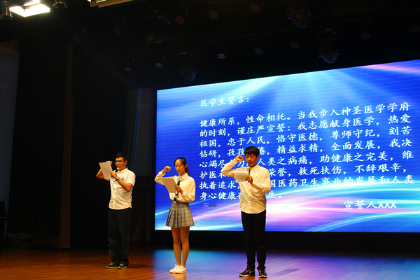 伴随着婉转悠扬的音乐,仪式进入高潮,与会的所有教师一同登台,依次为到场的175名新生点印朱砂,同学们满怀着怀虔诚和喜悦登上舞台,接受恩师的洗礼和诫勉。朱砂印礼完毕后,全体新生在三位学生代表的带领下向恩师行拜谢礼,表达自己成年以后不忘恩情、勇挑重担的信念和决心。最后,全体新生共同宣读《医学生誓言》,洪亮的声音响彻整个会场,透射出同学们立志投身医学、济世活人的坚定信念,神圣而庄严的成人礼仪式圆满落下帷幕。