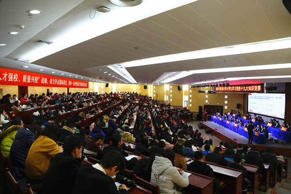 本次比赛共有12支学院代表队参赛。竞赛设必答题、抢答题、风险题和巅峰对决四个环节。题目设计既充分体现了十九大报告、新党章和习近平总书记系列重要讲话精神的精髓,又与学校事业发展现状和大学生身边的现实案例相结合。各代表队在比赛中均表现出敏捷的思维和扎实的理论功底,现场比分一度呈胶着上升状态。本次活动还设置了观众互动、现场访谈等环节,在活跃现场比赛气氛的同时也增加了全体师生员工共同参与学习的热情。