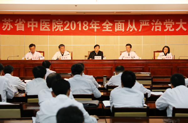 南京中医药大学党委常委、一附院党委书记翟玉祥教授首先在大会上作全面从严治党落实党委主体责任报告。报告以《强化责任担当,聚焦创新发展,以永远在路上的精神深化全面从严治党》为题,总结了过去一年医院在全面从严治党方面取得的成绩,并对2018年的党建工作提出了以下几点要求:一是以习近平新时代中国特色社会主义思想为指引,深入学习贯彻十九大及全国两会精神;二是严字当头,拧紧思想“总开关”,扎实推进高素质党员干部队伍建设;三是固本强基,提升基层党组织组织力,夯实医院事业科学发展的组织基础;四是正风肃纪,全面落实管党治党“两个责任”,以优良的党风促院风带行风。