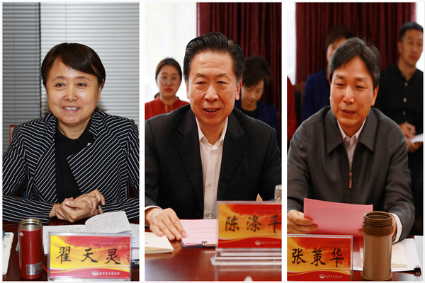南京艺术学院党委副书记、纪委书记翟天灵传达省纪委要求(左一)、南京中医药大学党委书记陈涤平出席汇报会并致欢迎辞(中)、南京中医药大学党委副书记、纪委书记张策华主持会议并作工作情况汇报(右一)
