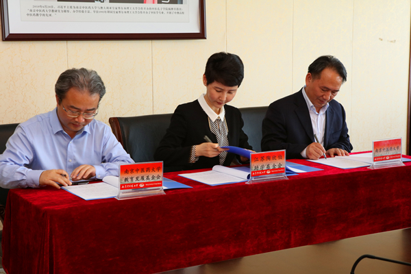 江苏陶欣伯助学基金会李建伟理事长(中)、南京中医药大学副校长黄桂成(右一)、南京中医药大学教育发展基金会曹凯秘书长(左一)签署“伯藜助学金”资助协议