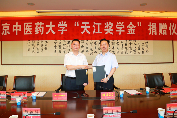 陈涤平书记(右)、俞敏总经理(左)分别代表南京中医药大学教育发展基金会、江阴天江药业有限公司签署捐赠协议