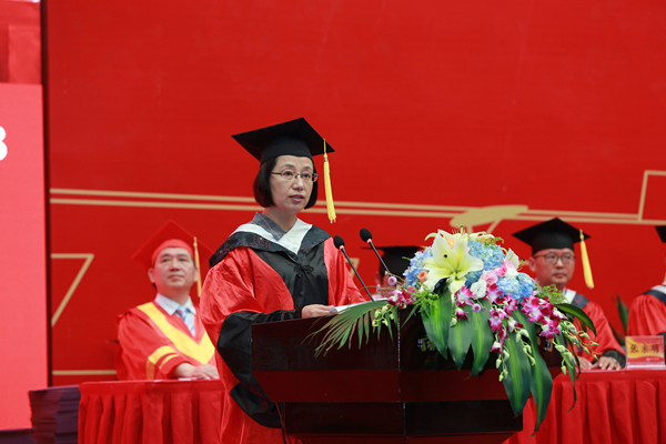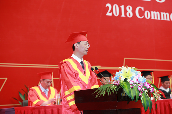 胡刚校长代表学校向圆满完成学业的3245位2018届毕业生表示热烈的祝贺,期待大家在即将起航的新时代征程中演绎精彩的奋斗华章:尽显一流的模样、一流的特质、一流的才华,作出一流的贡献,成为一流的人才。广大毕业生迎来了人生中非常重要的节点和转折,意味着变化和未知,意味着挑战和机遇,意味着昨日“弃我去者不可留”,意味着明日“无限风光在险峰”,意味着我们还必须创造新的辉煌,而且是更为全面、更为持久、更为高质量、更富时代意义的辉煌!他阐释了自己的幸福观:奋斗本身就是一种莫大的幸福,是人生的精彩乐章。学会节制,能够心无旁骛的奋斗,是幸福的;寻得志同道合、携手前行的“伙伴”,不至迷失无助的奋斗,是幸福的;善于利用人类已有的文明成果,站在巨人肩膀上的奋斗,是幸福的;不断追求卓越、成就自我,能够实现人生价值的奋斗,是幸福的!