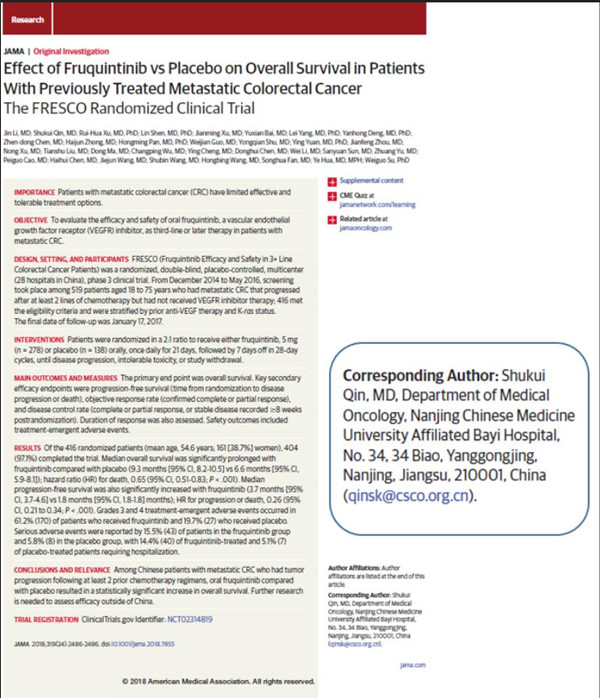2018年6月26日,国际著名医学期刊《美国医学会杂志》(The Journal of the American Medical Association, JAMA)在线全文发表了我校附属八一医院秦叔逵教授关于呋喹替尼三线治疗晚期结直肠癌的随机、双盲、安慰剂对照、全国多中心的III期临床试验(FRESCO)研究成果。这是第一篇全文发表在JAMA上的中国抗肿瘤新药临床研究论文,研究成果将对晚期结直肠癌的临床治疗具有重要的指导价值。
