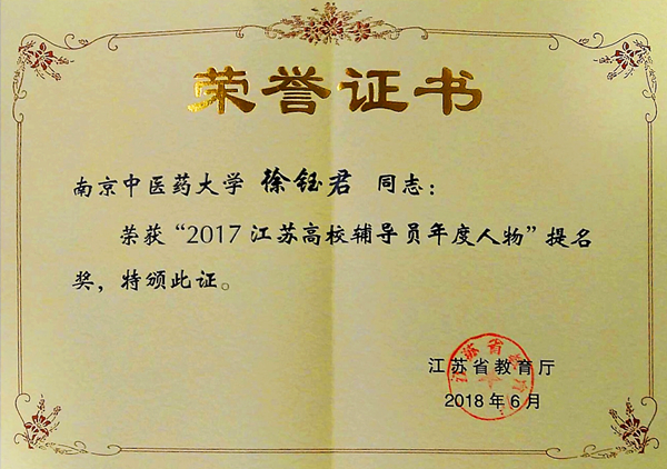近日,江苏省教育厅开展“2017江苏省大学生年度人物暨高校辅导员年度人物”推选展示活动。我校药学院辅导员徐钰君获“2017江苏高校辅导员年度人物”提名奖,药学院本科生刘莲荣获“2017江苏省大学生年度人物”提名奖。