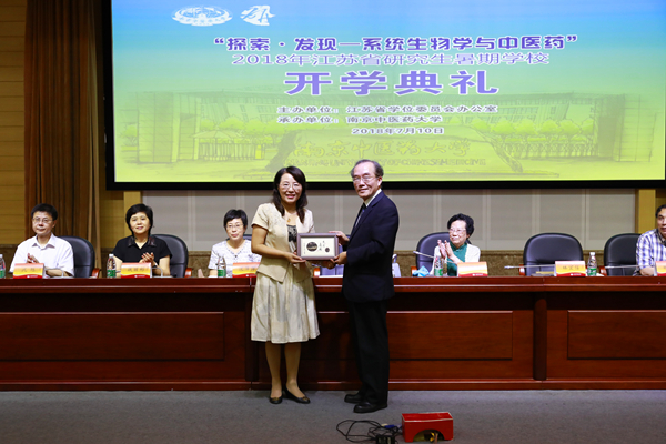 开学典礼上,台湾慈济大学林宜信教授向我校赠送礼物。徐桂华副校长代表学校向南京大学沈萍萍教授颁发《系统生物学概论》博士研究生课程负责人聘书。南京大学沈萍萍教授随后向学员们介绍了暑期学校课程安排。她指出,系统生物学的核心思维和研究策略与中医药学高度契合,对于阐释中医药科学问题具有重要的意义。