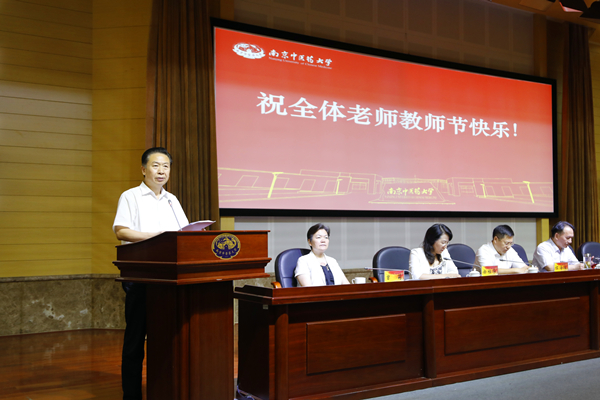 学生代表药学院学生殷格漫同学代表全校学生为老师们献上节日的祝福,向老师们致以崇高敬意,表示将在老师们的培育引导下,努力学习、勇于实践,成长成才,为学校“双一流”建设和“健康中国”事业做贡献。教师代表、中医药文献研究陈仁寿老师,深情回顾了自己从教三十年的历程,抒发了他热爱教育、热爱学生、热爱学校的真挚情感,表达继续奉献教育事业、为学生成长贡献心力的决心。教师代表、附属南京中医院针灸科阮志忠老师发言,以教师身份自豪,以能从事育人工作感到幸运,表示将一如既往做好带教工作,密切与学校的关系、密切与学生的联系。