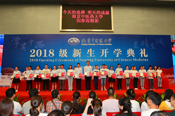 为表彰先进,激励新生学子在入学伊始即奋发进取,方祝元副校长宣读了《关于表彰南京中医药大学2018年度“优秀本科新生奖学金”获得者的决定》,主席台领导和嘉宾为新生奖学金获得者代表颁奖,并赠送学校主编的《中药大辞典》。