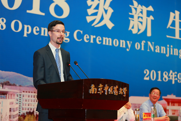 本科生代表张露可同学、研究生代表郑杰同学、留学生代表安东尼(瑞士)同学先后发言。他们表达了对大学生活的期盼和对勤奋求学的决心。带着“我们应该成为什么样的人”的思考,张露可同学号召零零后新生,立志成为有道德的人、有知识的人、身心健康的人、对社会有用的人,不负家国期望,承担应有担当。郑杰同学认为,作为新时代的研究生,应把国家和社会的利益与自身发展紧密联系起来,立足国家的发展和需求,放眼全世界,将祖国中医药文化发扬光大。安东尼用诙谐幽默的语言,分享自己在南中医求学的经历,表达了对中医药文化的喜爱。