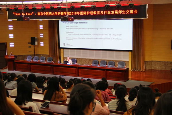 9月16日下午,由南京中医药大学护理学院举办的“Face To Face:南京中医药大学护理学院2018年国际护理教育及行业发展师生交流会”在仙林校区丰盛楼学术报告厅召开。本次交流会邀请英国阿尔斯特大学护理学院院长Sonja McIlfatrick教授,澳大利亚塔斯马尼亚大学护理学院院长Karen Frances教授、德国Vitos kurhessen(精神心理医院)护理部副主任蒋秋梅主任以及新加坡义安理工学院护理系高级讲师李文婕讲师四位主讲嘉宾,护理学院马勇院长、刘明副书记、副院长,以及教师代表、本科生代表和全体研究生两百余人参加交流会。交流会由中医护理教研室鹿竞文老师主持。