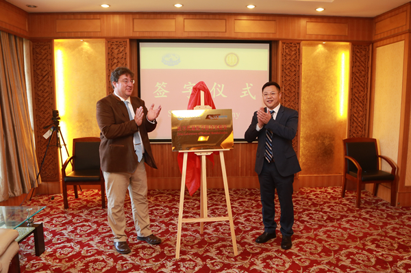 程海波副校长(右)和Oliver Fiehn教授(左)为“医学代谢组学联合实验室”揭牌