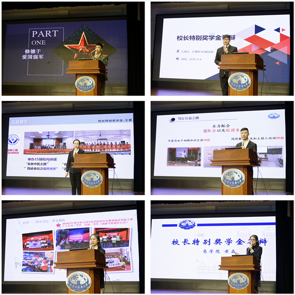 经过激烈的角逐,来自卫生经济管理学院的温秋锋、信息技术学院的翟文斌获得校长特别奖“修德奖”;来自药学院的黄晶和戚明珠、第二临床医学院的洑寒莹和董国启、护理学院的孟盈彤获得校长特别奖“勤学奖”;来自药学院姚泽洲、心理学院王蓉、第二临床医学院的滕美玲得校长特别奖“笃行奖”。