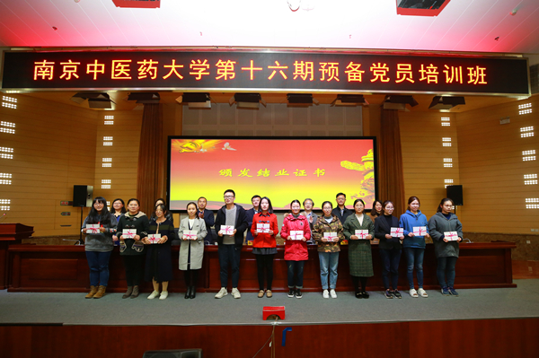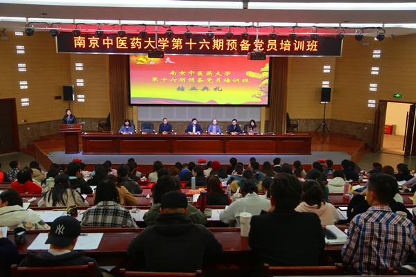 2018年11月30日晚,南京中医药大学第十六期预备党员培训班结业典礼在丰盛楼学术报告厅举行。校党委程纯书记,党委办公室、党委组织部、党委宣传部、党委学生工作部、研究生院等相关部门负责同志共同出席结业典礼。结业典礼由党委宣传部部长王珏主持。