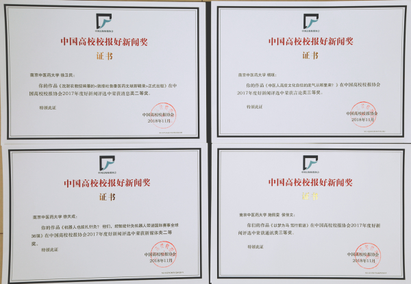 近日,2017年度“中国高校校报好新闻”评选结果揭晓。本次好新闻评选共收到来自28个省市自治区的665所高校报送的3321篇作品。我校校报《南京中医药大学报》登载、选送的《沈澍农教授编纂的<敦煌吐鲁番医药文献新辑录>正式出版》(作者:基础医学院徐卫民)荣获消息类二等奖;《中医人高度文化自信的底气从哪里来?》(作者:南京市中西医结合医院杨璞)荣获言论类三等奖;《以梦为马笃行前进》(作者:校报记者团施佩雯侯佳文)荣获通讯类三等奖。本次评选首次增设新媒体类好新闻评选项目,我校官方微信推送的《机器人也能扎针灸?他们,把智能针灸机器人带进国际赛事全球36强》(作者:第二临床医学院徐天成)荣获新媒体类二等奖。