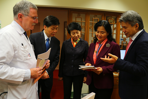 瑞士康复医院André G. Aeschlimann教授向余艳红书记介绍《中医与日常生活》德文版中医养生指南和中西医结合肿瘤日间门诊