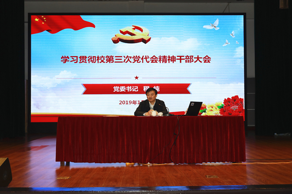2019年1月4日下午,学校在大学生活动中心小剧场召开学习贯彻校第三次党代会精神干部大会,全体校领导、中层干部、党支部书记,教授代表,各教研室主任,各级人大代表、政协委员,各民主党派负责人参加会议。校党委书记程纯主持会议并作报告。