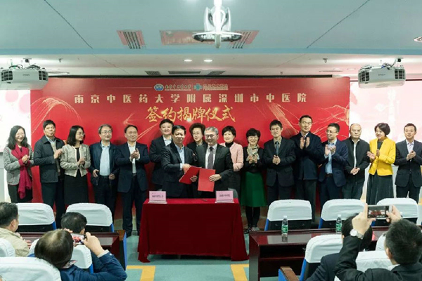 南京中医药大学校长胡刚与深圳市中医院院长易铁钢签署了附属医院合作协议书