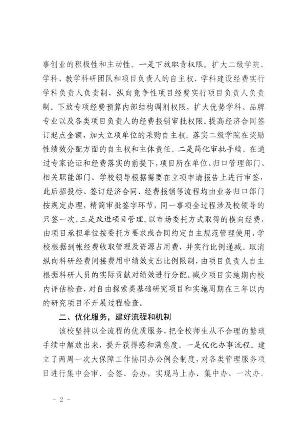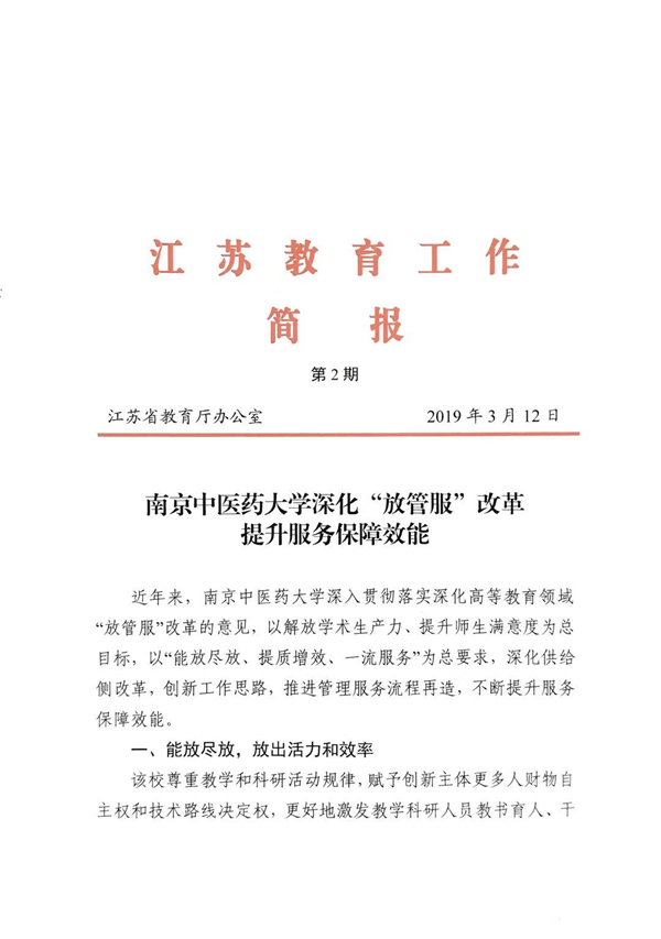 近日,《江苏教育工作简报》2019年第2 期专门刊发了题为《南京中医药大学深化“放管服”改革提升服务保障效能》的专门文章,专题介绍了我校以“能放尽放、提质增效、一流服务”为总要求,坚持需求导向、问题导向、目标导向,深化服务保障领域供给侧改革,创新性推进管理服务流程再造,以科学管理、优质服务培育壮大“双高”建设新动能的做法和经验。简报全文如下: