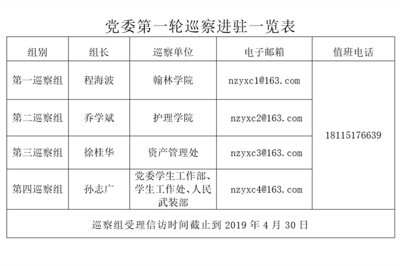 驻点巡察期间,各巡察组统一设立值班电话,分别设立电子邮箱和意见箱,主要受理反映被巡察单位领导班子及其成员、重要岗位干部执行党的政治纪律、廉洁纪律、组织纪律、群众纪律、工作纪律、生活纪律等问题的来信来电来访,其他不属于巡察受理范围的信访问题,将按规定转交有关部门处理。巡察组受理信访时间截止到2019年4月30日。