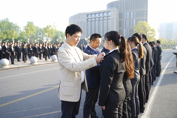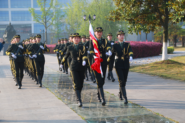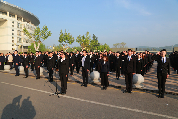 7时整,随着国旗护卫队整齐铿锵的步伐,全体人员庄严肃立,升国旗,奏唱国歌。团委书记、各学院学工书记为校院两级学生会主席佩戴团徽。