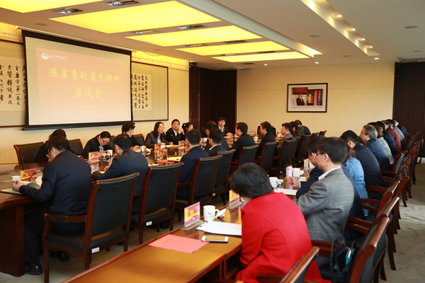 座谈会上,胡刚校长向陈星莺副省长一行简要介绍了学校在管理体制机制改革、人才培养模式改革、医教产教融合等方面的情况。胡刚校长指出,党和国家高度重视中医药事业的发展,陈星莺副省长一行来校进行专题调研,充分展现了江苏省对中医药事业的高度重视和加快发展振兴江苏中医的决心。当前,国家将选取部分中医药事业发展较好省份进行相关的“先行先试”改革。江苏作为中医药发源地之一,有着良好的基础,但“先行先试”改革点能否花落江苏,存在诸多挑战。会上,胡刚校长建议,江苏省要进一步深化体制机制改革,为中医药事业高质量发展保驾护航,在经费保障、资源配置、评价体系等方面加强统筹协调,为中医药事业高质量发展提供更有力的政策支持。胡刚校长表示,新时代的南中医人不扬鞭自奋蹄,将在省委、省政府的领导下,继续以高度的责任感和使命感,积极进取、开拓创新、追求卓越,推进“双一流”建设,把中医药继承好、发展好、利用好,为健康江苏与江苏经济社会高质量发展作出应有的贡献。与会其他领导、专家围绕调研主题踊跃发言,进行了热烈而深入的交流。