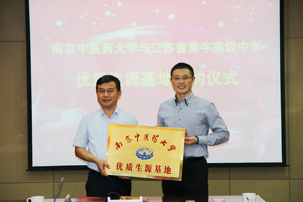 双方就今后进一步合作达成一致意见,并共同签署《南京中医药大学优质生源基地协议书》。乔学斌副校长为江苏省奔牛高级中学授牌。南京中医药大学党委办公室曹凯主任就近五年录取的江苏省奔牛高级中学学子在校就读的优异表现进行通报。