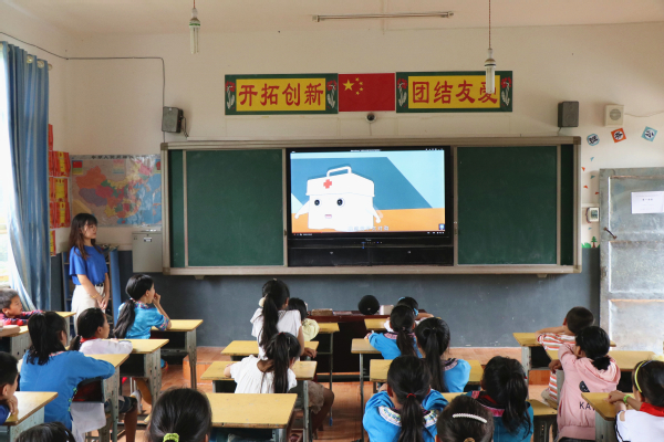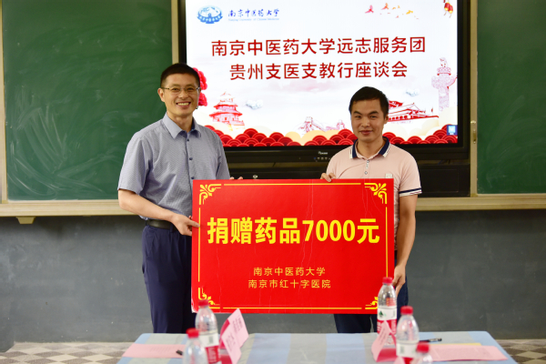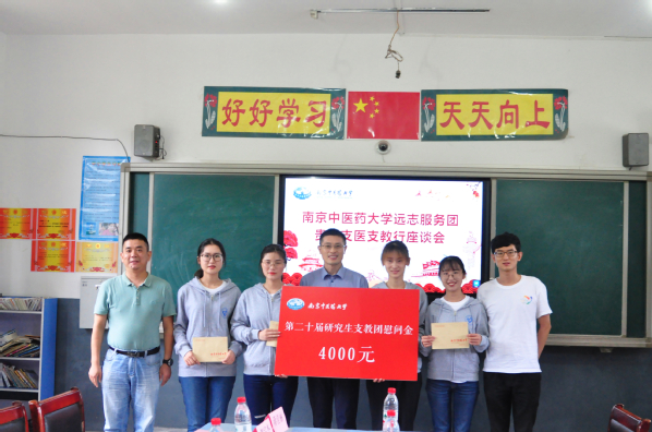 乔学斌副校长代表学校向研究生支教团志愿者发放慰问金,为归柳小学学习进步突出的12名小学生颁发“杏仁进步奖学金”。乔学斌副校长代表学校、江苏省红十字会和南京市红十字医院向归柳小学医务室捐赠药品。