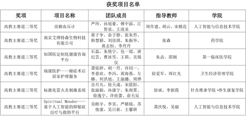 决赛期间,高教主赛道、青年红色筑梦之旅赛道、职教赛道三个赛道共250支队伍现场对决,最终高教主赛道产生一等奖40项,二等奖84项,“青年红色筑梦之旅”赛道产生一等奖20项,二等奖32项,职教赛道产生一等奖20项,二等奖54项。我校人工智能与信息技术学院《房颤血压计》和药学院《南京艾博特森生物科技有限公司》2个项目获高教主赛道二等奖,第一临床医学院《知国医定制化健康咨询平台》、卫生经济管理学院《瑞康医护——癌症术后居家护理服务》和针灸推拿学院·养生康复学院《标准化雷火灸刺激系统》3个项目获高教主赛道三等奖;人工智能与信息技术学院《Spiritual Mender——基于人工智能的抑郁症自疗与救助平台》项目获青年红色筑梦之旅赛道三等奖。南京中医药大学获高教主赛道和青年红色筑梦之旅赛道2个“优秀组织奖”。