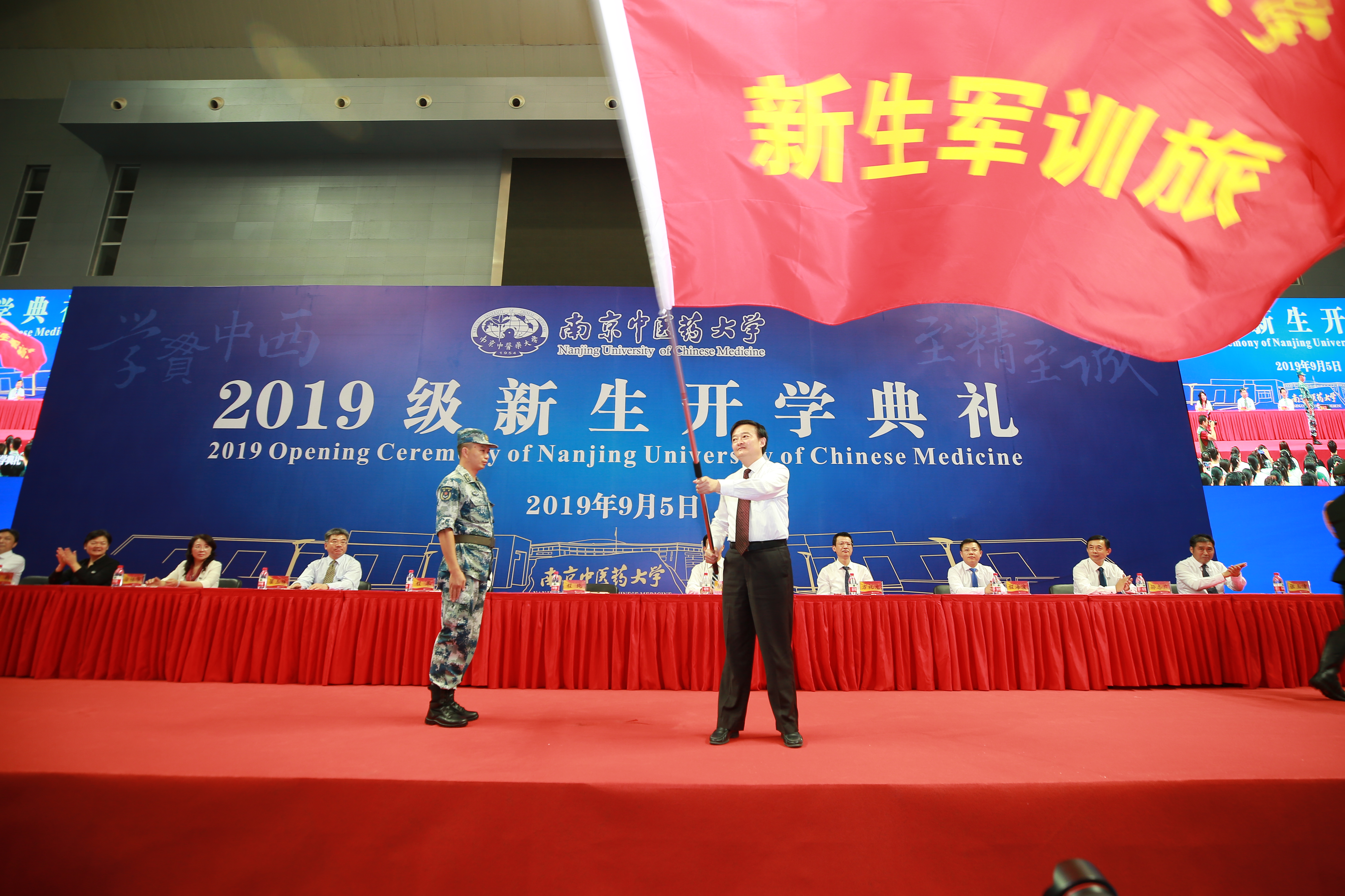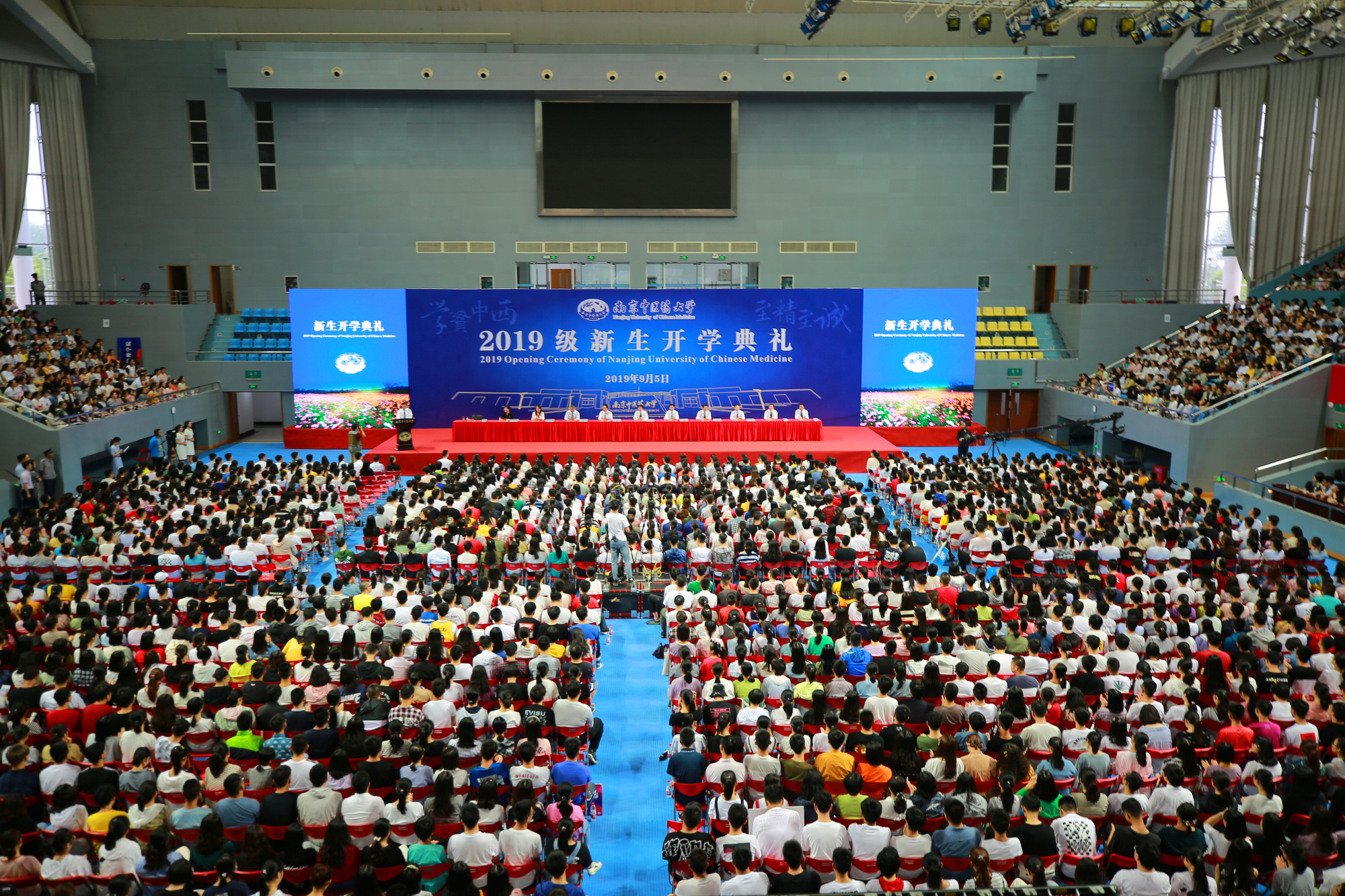 9月5日上午,南京中医药大学2019级新生开学典礼在仙林校区体育馆举行,4400余名新同学齐聚一堂,奋力开启青春新征程。开学典礼在雄壮的国歌声中拉开帷幕,校党委副书记、副校长张策华主持典礼。