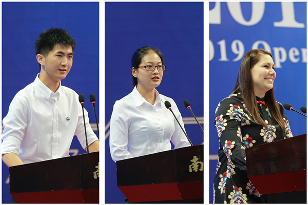 本科生代表缪青云、研究生代表徐柳、留学生代表苏美瑞(委内瑞拉)发言